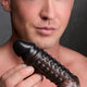 Add length and girth with this super soft enhancer sleeve! This bumpy sleeve is soft and flexible for a snug yet comfortable hug on your package. Externally textured with bumps and ridges to tantalize your lovers insides with internal texturing for your own pleasure. This enhancer sleeve is perfect for couples who want to experiment with a bigger shaft without discomfort and as soon as the mood strikes! Both the exterior and interior of this sleeve are textured for intense stimulation! The outside of this sleeve features soft and dynamic nubs to enhance your thrusts into your partner, while the inside features smaller nubs and textured ribs to rub your shaft as you play. Use plenty of water-based lubricant on the outside, inside, and along your shaft for a slick and pleasurable sensation. The 5.5 inch hollow inside of this sleeve fits most cock sizes - the soft TPR material hugs and holds most shafts without discomfort. This sleeve is held in place via the stretchy ball strap for added security and less slippage while you thrust. The tip of this sleeve is semi-solid, but still soft, for an extra satisfying inch to reach new depths into your lover. Measurements : Overall length 7 inches, shaft diameter 1.8 inches, sleeve opening diameter 1.4 inches, ball strap openning diameter 1.4 inches, sleeve depth 5.5 inches, semi-solid 1 inch tip Materials : TPR Color : Smoke