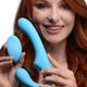 Equip yourself with this velvety, double ended strapless strap-on! Insert the vaginal bulb and hold up the Mighty Riders phallic shaft without a harness so you can peg and penetrate in complete freedom. Featuring powerful vibration, a waterproof build, and a wireless remote controller for the ultimate hassle free strap on experience! The slight curve of the shaft helps you target sweet spots like the male prostate or the female g-spot with ease while the textured clitoral pad rubs and vibes your clit to please you while you thrust. The combination G-spot pleasure from the vaginal bulb and clitoral stimulation from the textured pad reward the wearer with a blended orgasm as they thrust! The powerful dual motors in the Mighty Rider buzz with 3 intensities and 7 patterns, controllable via simple to use buttons on the base of the shaft or with the included remote controller. Recharge the motors when the power runs low with the included USB charging cable! The included wireless controller is rechargeable with the same cord. Made with premium, silky smooth silicone that is phthalate free for a luxurious and body safe feel so you can enjoy worry free! Constructed with IPX7 waterproofing for fun in the shower and ease of cleaning. Compatible with waterbased lubricants only. Measurements : Overall length 8.4 inches, insertable length 5.2 inches, widest shaft diameter 1.3 inches, narrowest shaft diameter 1 inch. Vaginal bulb insertable length 4 inches, vaginal bulb width 1.3 inches. Materials : Silicone, ABS Plastic Color : Blue