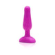 A small, easy-to-insert silicone butt plug, with one motor. This compact, certified body-safe, silicone plug offers 6 vibration levels and 15 vibration patterns for many erotic combinations. One-touch, wireless remote control technology that works up to 30 feet away. USB rechargeable battery that charges in 2.5 hours and runs 1.5 hours. Battery level indicator flashes when charging is required. Measures 3.35 in. long insertable, 1 in. diameter.