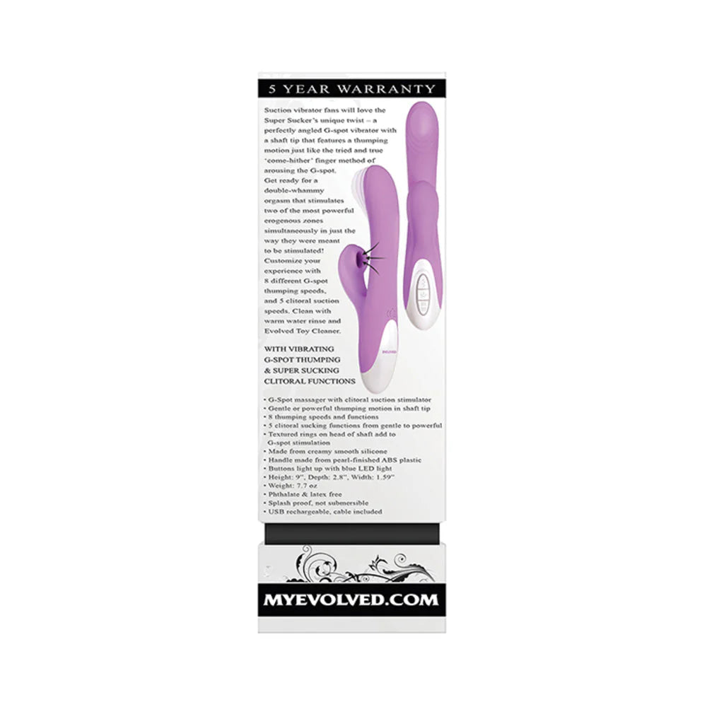 Suction vibrator fans will love the Super Sucker's unique twist - a perfectly angled G-spot vibrator with a shaft tip that features a thumping motion just like the tried and true "come-hither" finger method of arousing the G-spot. Get ready for a double-whammy orgasm that stimulates two of the most powerful erogenous zones simultaneously in just the way they were meant to be stimulated! Customize your experience wtih 8 different... Read More