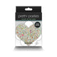 Hearts, Stars, Crosses and more! Pretty Pasties by NS Novelties is a collection of adhesive nipple covers guaranteed to excite and entice. Comfortable and secure during wear and effortless to place and remove. Available in an assortment of shapes, colors, patterns, and finishes – Pretty Pasties are the perfect body décor for a passionate time.Product Weight: 0.92 (Oz)Package Dimensions: 4.84 x 3.35 x 0.55 (Inches)Product Material: Glitter Fabric