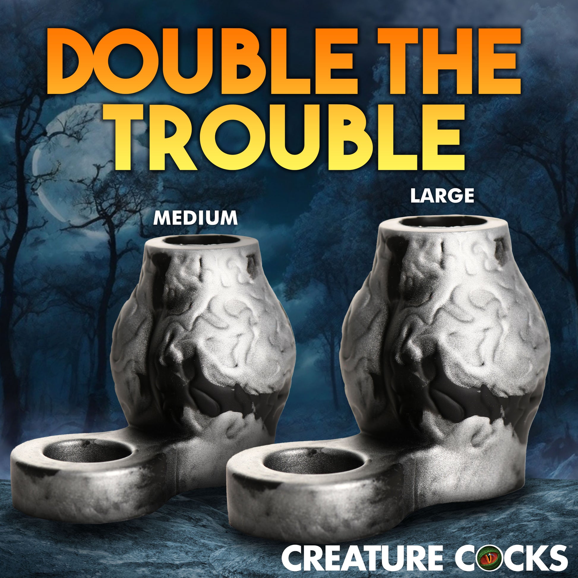 Become the silver wolf of your partner's dreams or nightmares with this Night Prowler sleeve and ball stretcher! It fits over your shaft, adding pressure to your rod, while also wrapping around your balls and stretching them! Made out of premium, phthalate-free, body-safe silicone, it is best used only with water-based lubricants only. Enhance your playtime and the sensations by giving yourself a rod that gets thicker by adding these two bulging, wolf-knots at the base! It stays in place due to the ball stretcher wrapped around your family jewels, and essentially tugs your balls every time your partner goes deep! Enjoy adding this to your kinky cosplay and fantasy roleplay while indulging with your partner! After use, wash it with warm water and mild soap, then rinse it off and spray it with a toy cleaner. Pat dry and store in a cool, dark place.