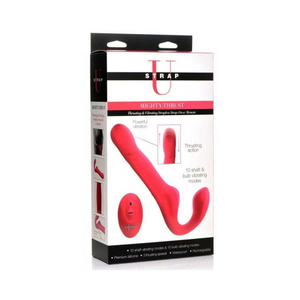 This strapless strap-on gives a little more power to each thrust with dual motors that thrust and vibrate! Enjoy 3 speeds of power packed thrusting from the shaft and another 10 speeds of vibration that you can set individually for the shaft and the wearable strapless strapon bulb. All stimulating sensations can be changed and set using the wireless, battery-operated remote control. The shaft and bulb are made of plush, premium silicone that is phthalate-free and body-safe. The shaft has soft ridges that add to each thrust as you penetrate your partner and the round bulb on the end is to help hit their G-spot! The strapless strapon bulb is ed into the wearer to be held by their kegel muscles. As you both get aroused, it gets tighter and easier to hold! Made with IPX6 waterproofing tech, feel free to play in the shower or get wet! Afterwards, recharge using the USB charging cable provided. Turn the toy and the remote on to pair them, then grab your favorite water-based lubricant. Warm up your partner so they`re ready to be penetrated by rubbing the vibrating shaft across their erogenous zones, letting them get used to the size and feel of the dong. When theyandrsquo;re ready, the bulb inside yourself and assume the position most comfortable for you both. Slowly start penetrating, allowing them to do most of the work at first. When theyandrsquo;re open and ready, give them a little extra thrusting with your hips and with the thrusting motor! Up the intensity on the vibrations using the remote control and enjoy ecstatic pleasure for your both! After play is over, wash the toy with warm water and soap, then spray with a toy cleaner and wipe dry. Store in a cool, dark place away from lube. Measurements: Overall length: 9.5 inches, Dildo able length: 6 inches, Dildo widest able width: 1.5 inches, Vaginal bulb able length: 4 inches, Vaginal bulb width: 1.4 inches Materials: Silicone, ABS plastic Color: Pink Note: Remote distance up to 32ft, requires 1xCR2032 battery (included). Waterproof rating of IPX6; can withstand powerful water jets. ** Key Features:------------------------------------------------------------ Thrusting Shaft: Enjoy 3 powerful thrusting speeds as the shaft moves and penetrates your partner! Remote Controlled Vibes: This powerful vibrating shaft has 10 different vibration settings that can individually be controlled to be felt in both the bulb and the shaft! You and your partner can choose your own preferred setting and enjoy! Change settings with the battery-operated remote control. Strapless Fun!: Use the plush, silicone bulb instead of straps and place it inside the wearer. They can then hold it with their kegel muscles and use it as an extension of themselves! Premium Rechargeable Silicone: The shaft and bulb are all made out of premium, plush and silky smooth silicone that is phthalate-free and body-safe to enjoy. The shaft has extra ridges that stimulate the receiver and a curved, bulbed end for G-spot stimulation as the motors vibrate and thrust! To recharge, simply use the USB charging cable provided.