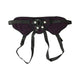 Plush strap on harness with interchangeable rubber O-rings: 1.5 inches, 1.75 inches, 2 inches. Includes channel for bullet vibrator.