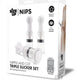 The Nipple and Clit Sucker Set includes two smaller suckers and one large sucker, perfect for blended nipple and clit pleasure. The easy-to-use twisting knob allows for precise pressure selection for custom suction sensitivity. Also included in the box are a pair of non-piercing nipple rings.